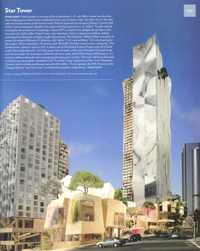 Frank Gehry’s latest project is coming to life in downtown L.A.: a $1 billion mixed-use development featuring two shimmering residential towers, one 19 stories high, the other 48, for the international and downtown professional crowd. Directly opposite his swooping Disney Concert Hal, Gehry’s new commission will add some style to the famously boxy L.A. skyline. Trouble may be brewing for the architect in Cambridge – where MIT is suing him for alleged design flaws in his four-year-old, $300 million Stata Center – but elsewhere, Gehry’s signature tumbling, folded, and warped surfaces are as highly sought-after as ever. His employer, William Witte, president of project developers Related of California, call Gehry’ “L.A.’s star architect.” At a city hearing for the project, Witte remembers, “Everyone said, ‘Be bold!’ And the current vision is amazing.” The development, slated to open in 2011, is phase one of the Grand Avenue Project and will include nearly 500 residential units, 250,000 square feet of retail, a 295-room Mandarin Oriental Hotel, and a 16-acre park. Its centerpiece will be the 488-story tower, which Witte hopes will become L.A.’s premium address along the city’s emerging performing corridor. The tower will house the hotel and 266 luxury apartments, modeled on the “Five Star Living” residences at New York’s Mandarin Oriental, which includes penthouses valued at $35 million. “It’s not going to be Fifth Avenue or the Champs-Elysees,” says Gehry, but “it could end up a pretty unique thing.”